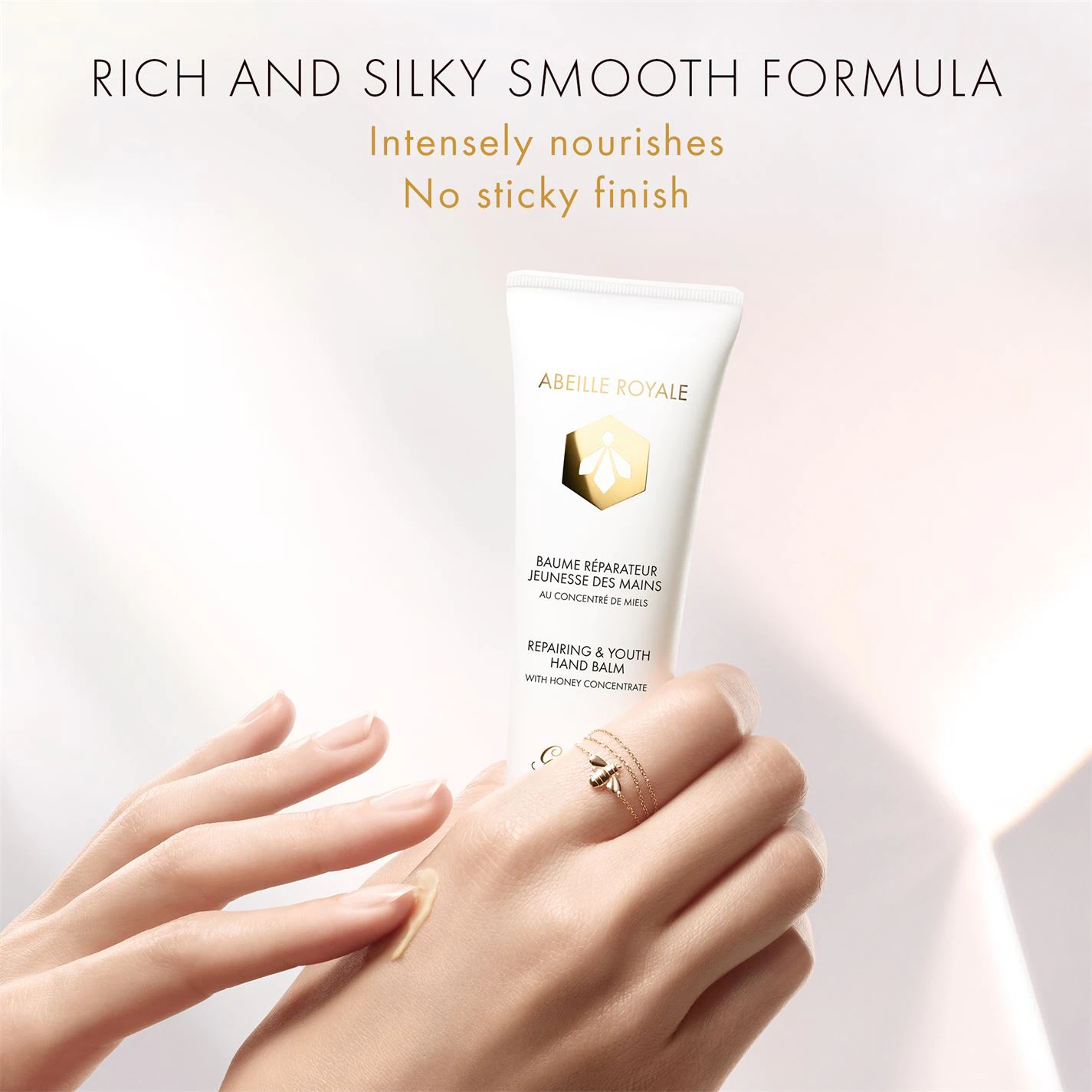 The Guerlain Abeille Royale Repairing and Youth Hand Balm has a rich and silky smooth formula that is rapidly absorbed and leaves hands feeling soft, smooth and visibly younger looking.